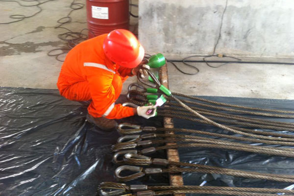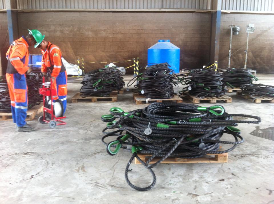 Temos como procedimento na preservação e certificação a lavagem de todas as eslingas, a pintura das extremidades a lubrificação com uma graxa especifica para lubrificação e proteção das eslingas.